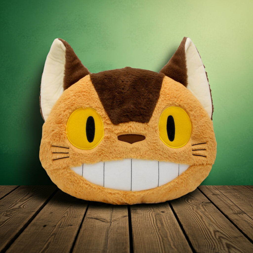 Verspielter Katzenbus: Das flache Kissen zeigt den Katzenbus mit seinem breiten Grinsen, eingefangen in seiner einzigartigen und liebenswerten Ausstrahlung, die die Fantasie von Studio Ghibli zum Leben erweckt