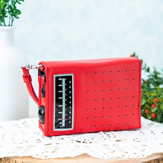 Design mit Nostalgie: Die Tasche ist wie ein kleines, rotes Radio gestaltet – mit aufgedruckten Knöpfen, Lautsprechergittern und liebevollen Details, die sofort an Kiki's stürmische Zustelltage erinnern.